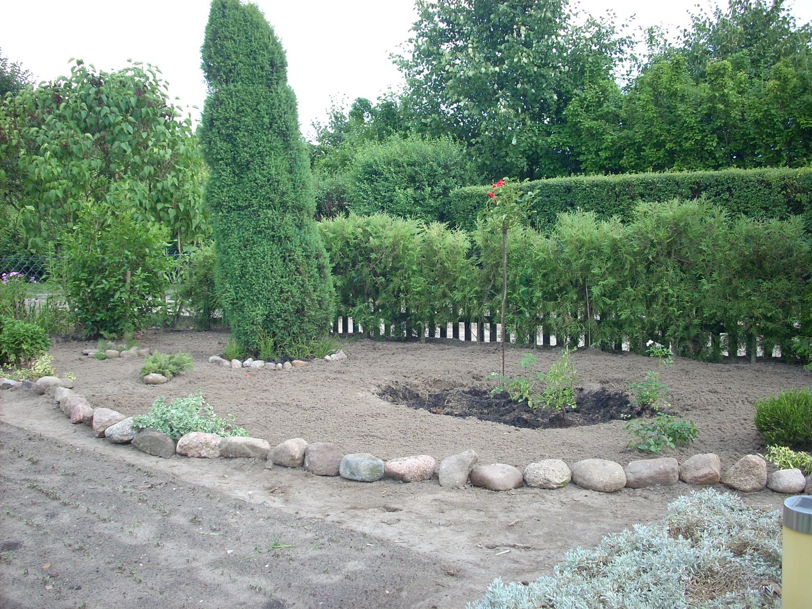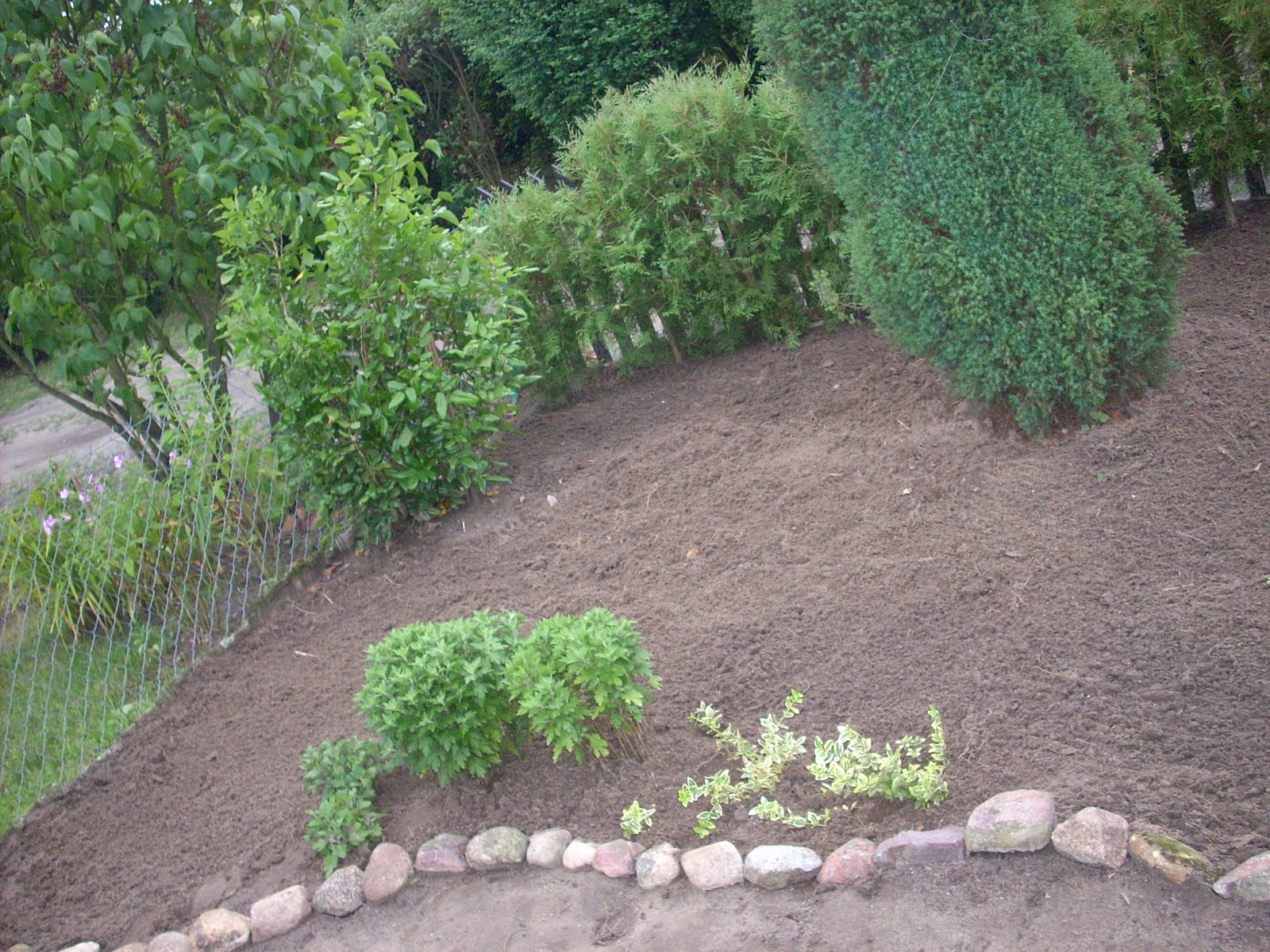 Za progiem witały nas konwalie-przekwitnięte i szpecące-natychmiast usunęliśmy.Nasadzę tu lawendy i wrzośców.Zaczątki już widać:)