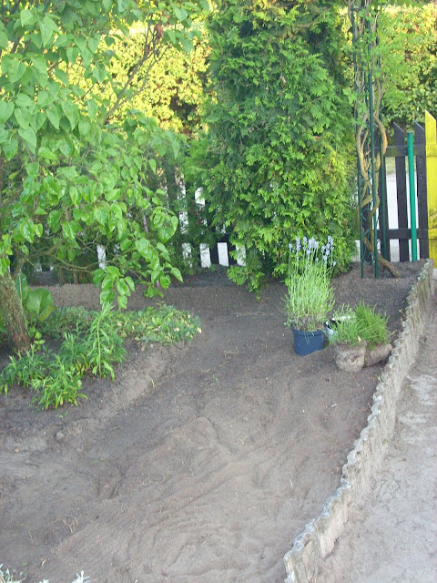 Za progiem witały nas konwalie-przekwitnięte i szpecące-natychmiast usunęliśmy.Nasadzę tu lawendy i wrzośców.Zaczątki już widać:)