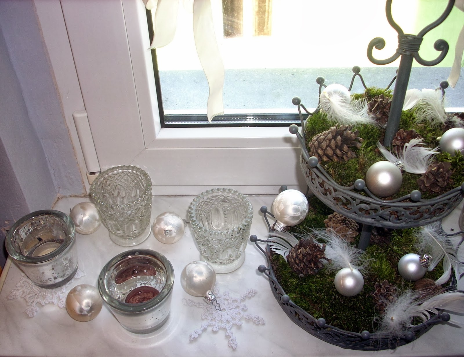 Okno póki co skromnie jest zapowiedzią kolorów tegorocznych świąt. Srebro,szarość, biel, taki klimat chciałabym utrzymać na stole.